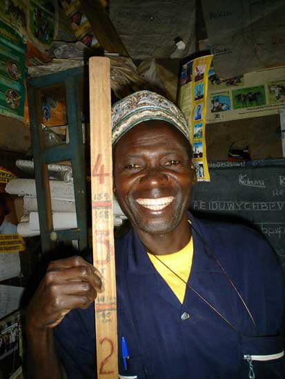 Edirisa Wangwenyi, one of the first village volunteers who distributed ivermectin to fight onchocerciasis in Uganda, stands in his home, which is filled with health education materials and inspirational posters.