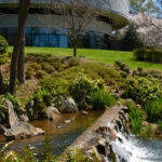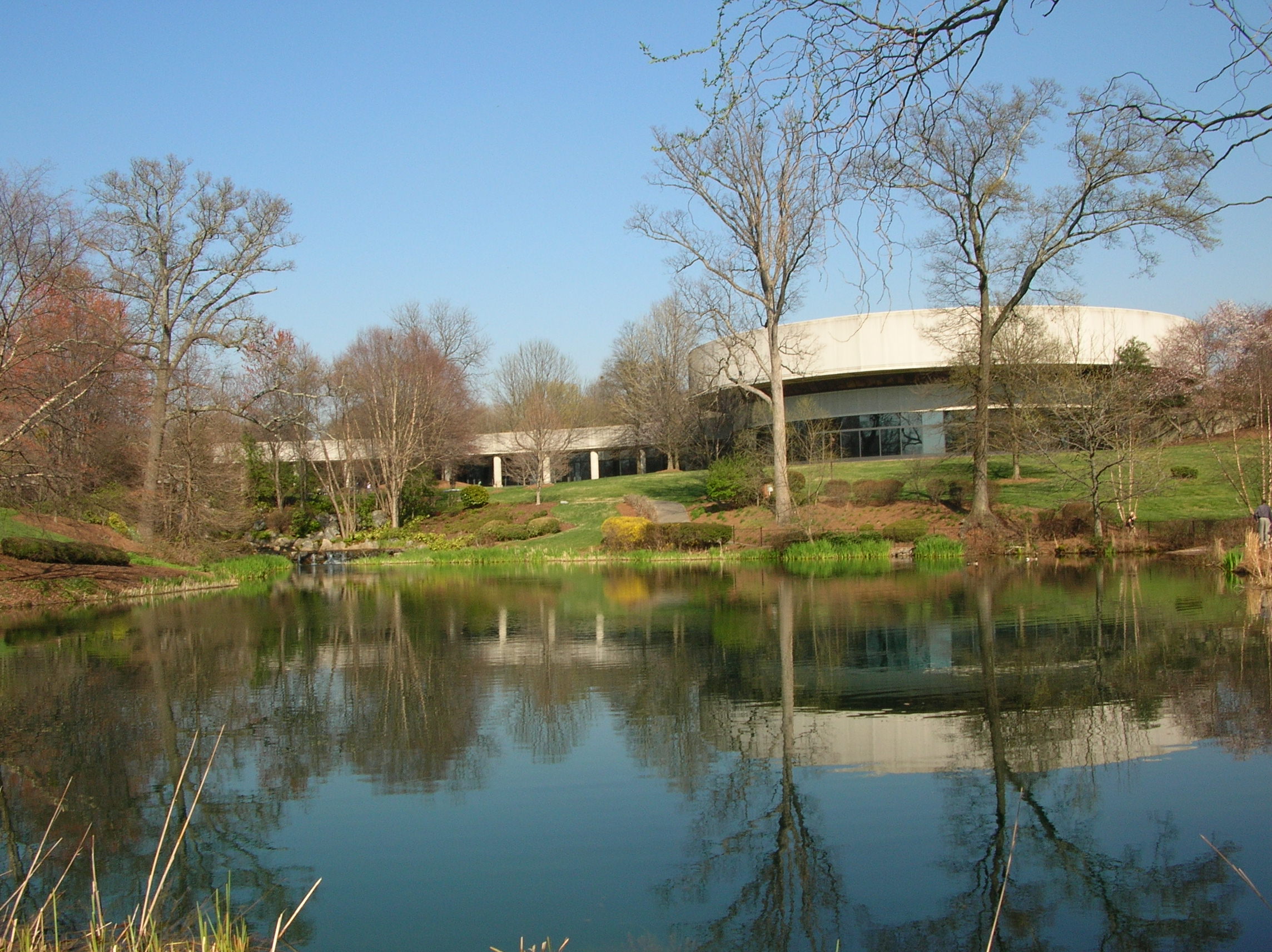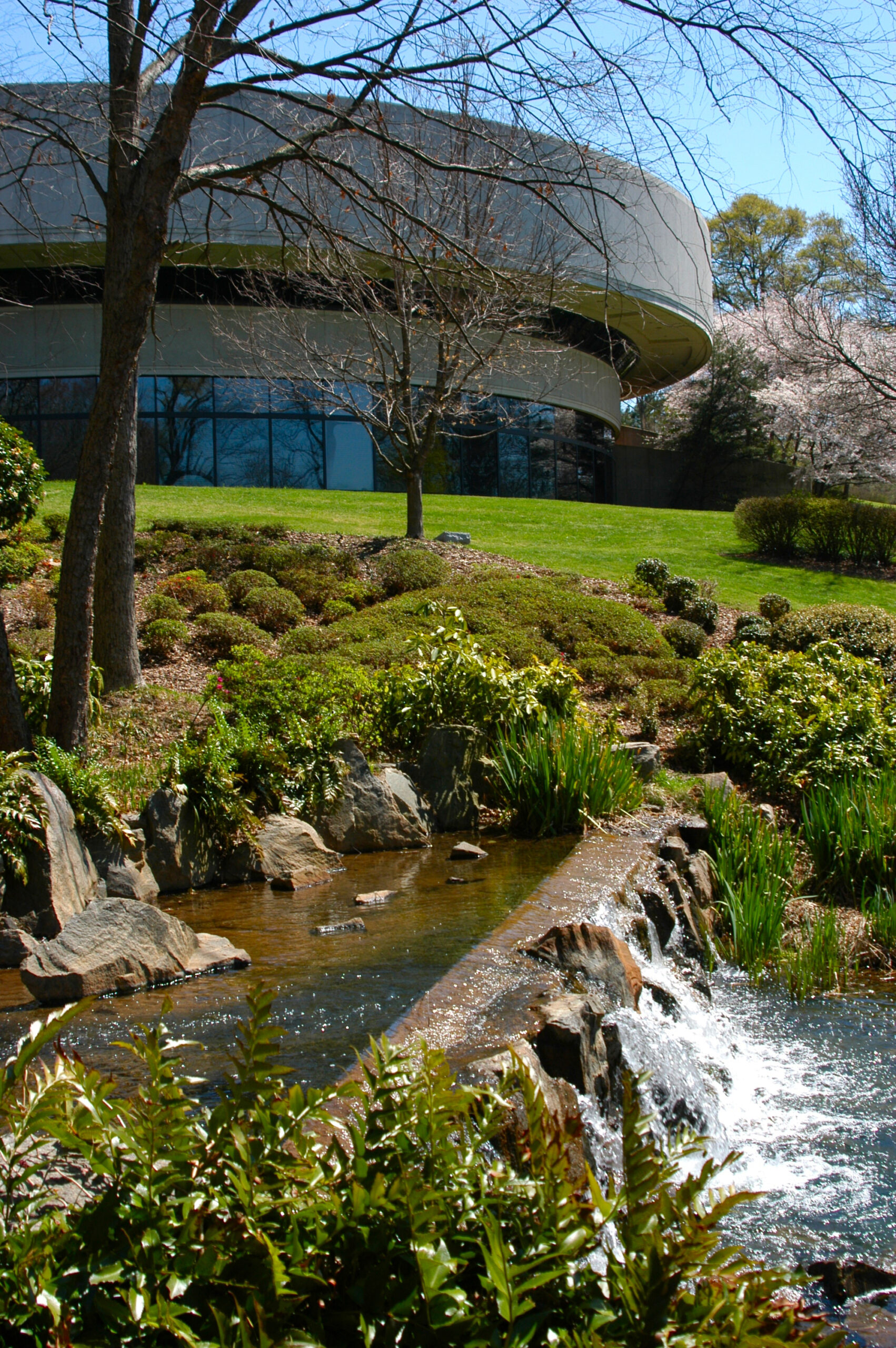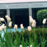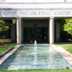 Entrance to the Jimmy Carter Library and Museum, which is located next to The Carter Center in a 35-acre wooded park just five minues from downtown Atlanta. Together, The Carter Center and the Jimmy Carter Library and Museum comprise The Carter Presidential Center. Grounds include formal gardens, including a garden with 40 varieties of roses, sculptures, and waterfalls tucked between two small lakes in a serene Japanese Garden.