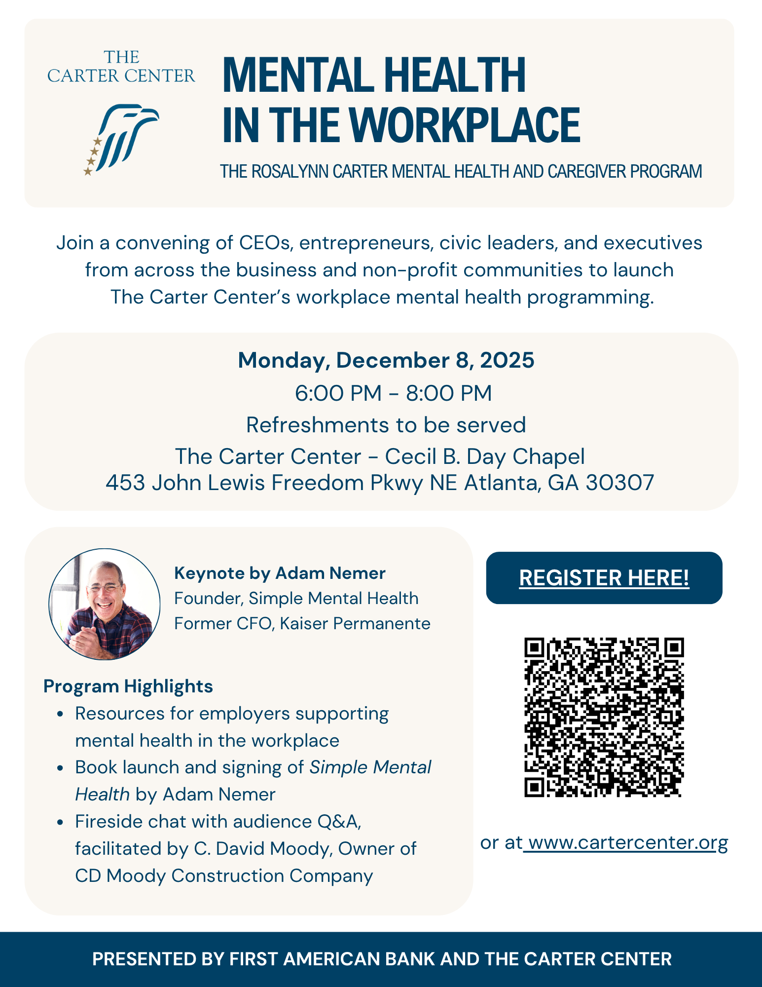 Join a convening of CEOs, entrepreneurs, civic leaders, and executives from across the business and non-profit communities to launch The Carter Center’s workplace mental health programming.