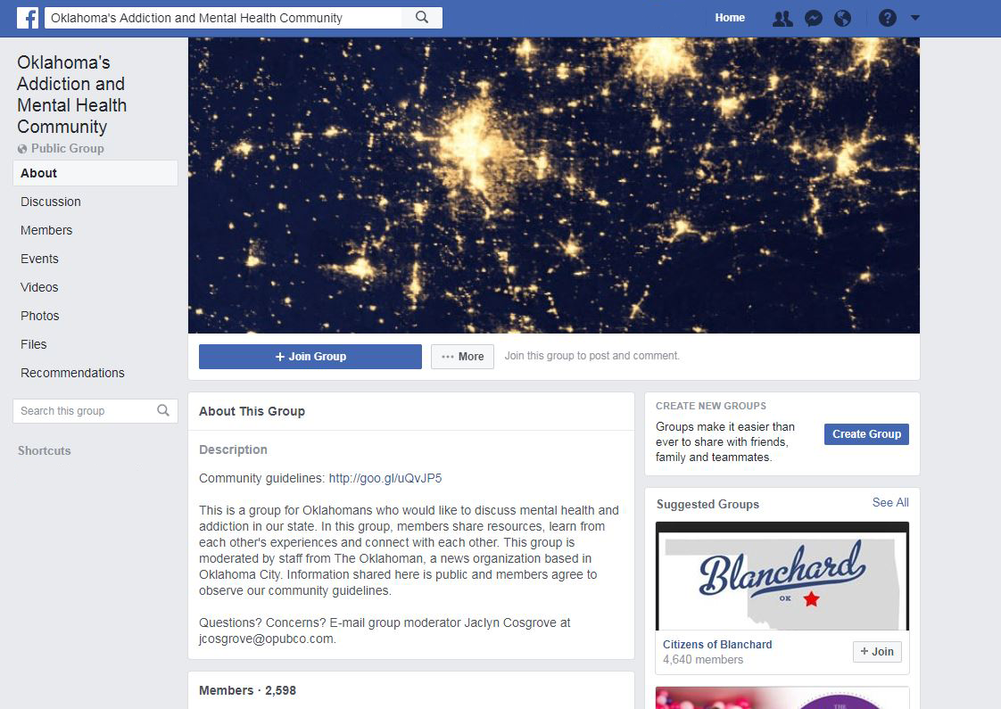 In response to reader interest, Cosgrove also created a Facebook page for Oklahomans to share mental health experiences and resources with each other. “Making the group public was an intentional attempt to fight stigma. And it was incredible to see how the Facebook group evolved over time into a community of people, ready and willing to help each other in crisis,” she says. “While I was moderator of the group, I saw strangers help each other find housing, mental health treatment, and support groups.”