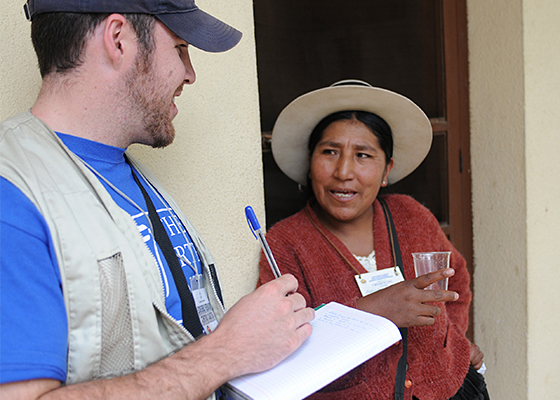 In Cochabamba, Bolivia, Carter Center long-term election observer Daniel Barnes speaks with a traditional women’s leader. Listening is a key part of every staffer’s job in the field. (Photo: The Carter Center)