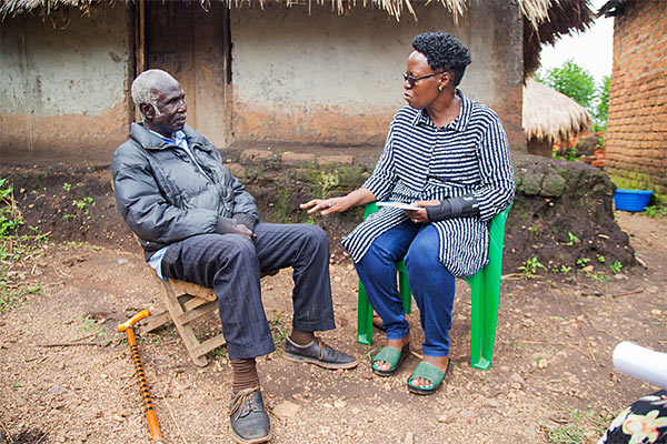 Steven Ocopcan speaks with Habomugisha about the devastating toll river blindness had on his community as a child. (All photos: The Carter Center)