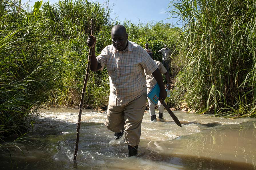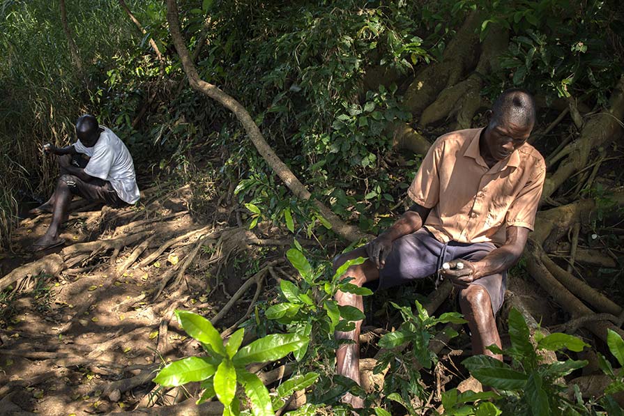 They check vegetation in rivers for evidence of fly larvae. They train and equip volunteers like Evans Kenyi and Julius Nyara, who sit beside the river early in the morning and again at dusk, rolling up their pant legs and using their legs as bait to catch flies for laboratory testing. And twice a year, they go house to house to distribute doses of Mectizan®.