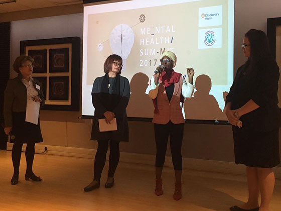 Marion Scher (journalist/media consultant and trainer), Mia Malan (health editor of Mail and Guardian), Hlubi Mboya (television personality), and Cassey Chambers (operations director, South African Depression and Anxiety Group) speak about mental health journalism at the 2017 Mental Health Summit in South Africa.