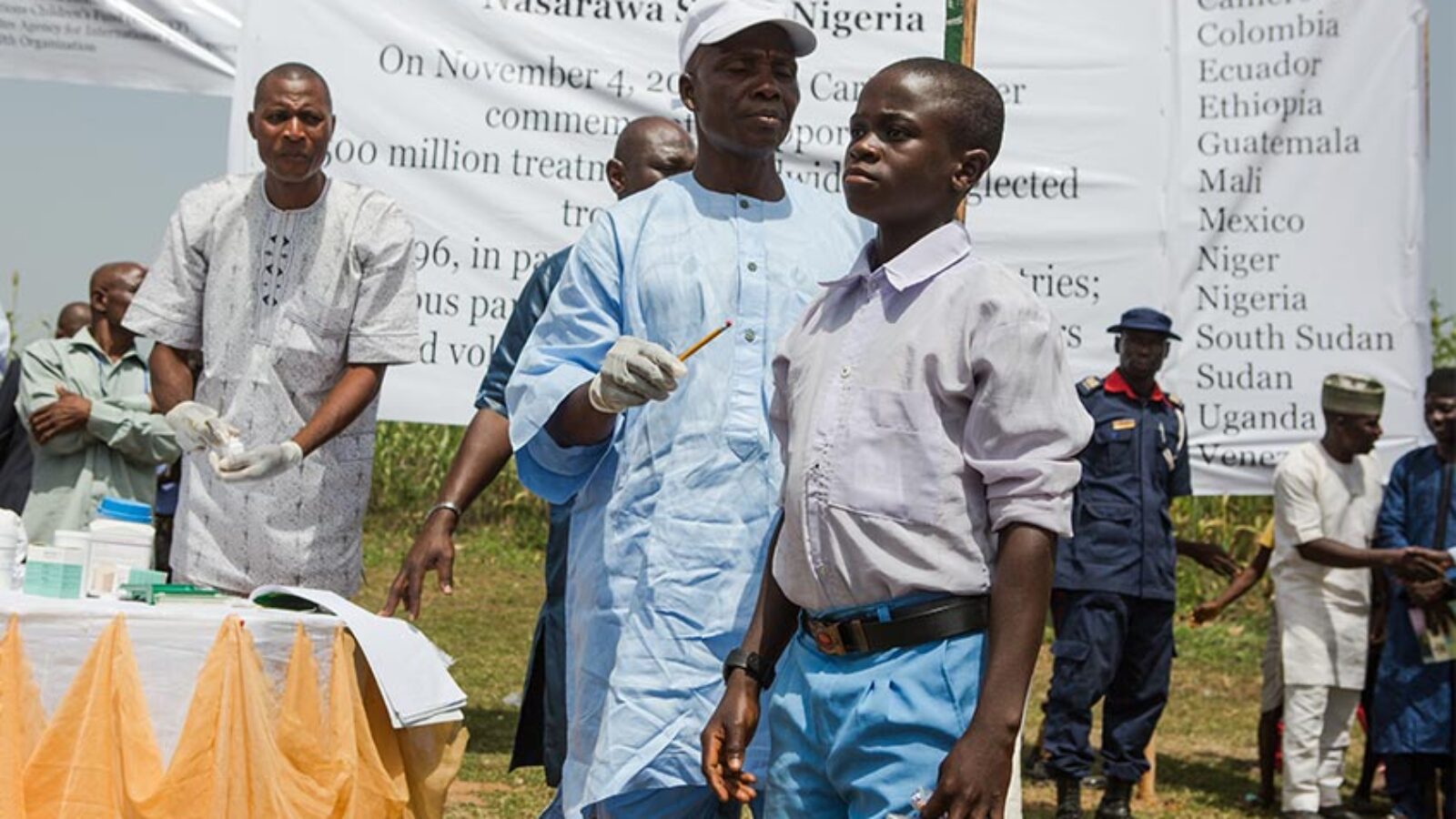Thirteen-year-old Jude Musa looked serious, even stoic, as a volunteer from his village gauged his height with a measuring stick. Community drug distributor Yusuf Maikeffi determined the proper dose of praziquantel and handed the tablets to the boy, who popped them into his mouth and chased them with fresh water from a plastic pouch.