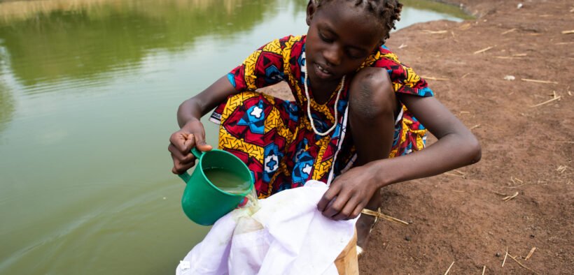 Eradicating Guinea worm requires filtering all drinking and cooking water in endemic areas. Ten-year-old Kurujwok Okoth Oriew, of Wichini village in the Gog district of Ethiopia, strains pond water through a household filter into a pail. (Photo: The Carter Center/Ryan Youngblood)