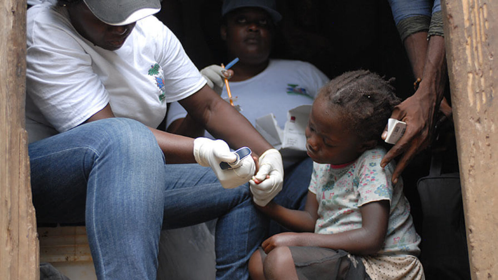 The five workers, wearing white t-shirts bearing the logo of the Ministry of Public Health, go door to door along stony paths. One is comparing locations written on a sheet with readings from a hand-held GPS device. They’re looking for 6- and 7-year-old children, to test their blood for signs of two mosquito-borne tropical diseases, malaria and lymphatic filariasis.