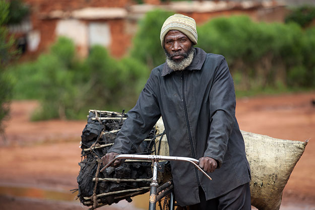 Since his farmland was seized in 2010, Kabwita has had to support his family by making and selling charcoal. After cutting the wood and firing it into charcoal bits, he makes a 50-kilometer bicycle trek to a market in Lubumbashi. (Photo: The Carter Center/G. Dubourthoumieu)