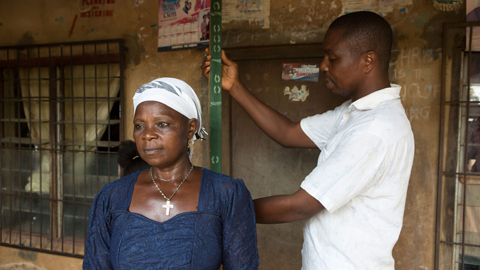 Those qualities shine through as Ani instructs groups and individuals on the threat of river blindness (technically called onchocerciasis) and how to avoid it. He carefully measures each person’s height to determine the proper dosage of Mectizan®. In other locations, distributors like Ani hand out other medications for tropical diseases including lymphatic filariasis and schistosomiasis.