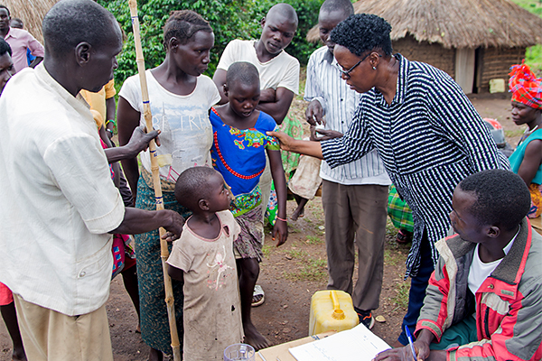 As the Carter Center’s country director in Uganda, Peace Habomugisha typically can be found out in the field, keeping the river blindness program on track. Here she helps measure a child’s height to determine the proper dosage of Mectizan®. This was the last drug administration in the Nyagak-Bondo area of Uganda, as transmission of river blindness has been successfully interrupted in the region.
